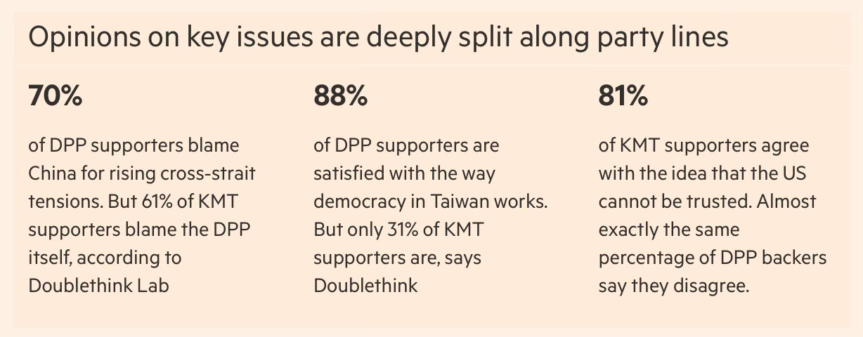 Oavsett hur det ligger till med detta så visar grafiken nedan från artikeln hur polariseringen mellan Kina-vänliga KMT och regeringspartiet DPP är verklig: