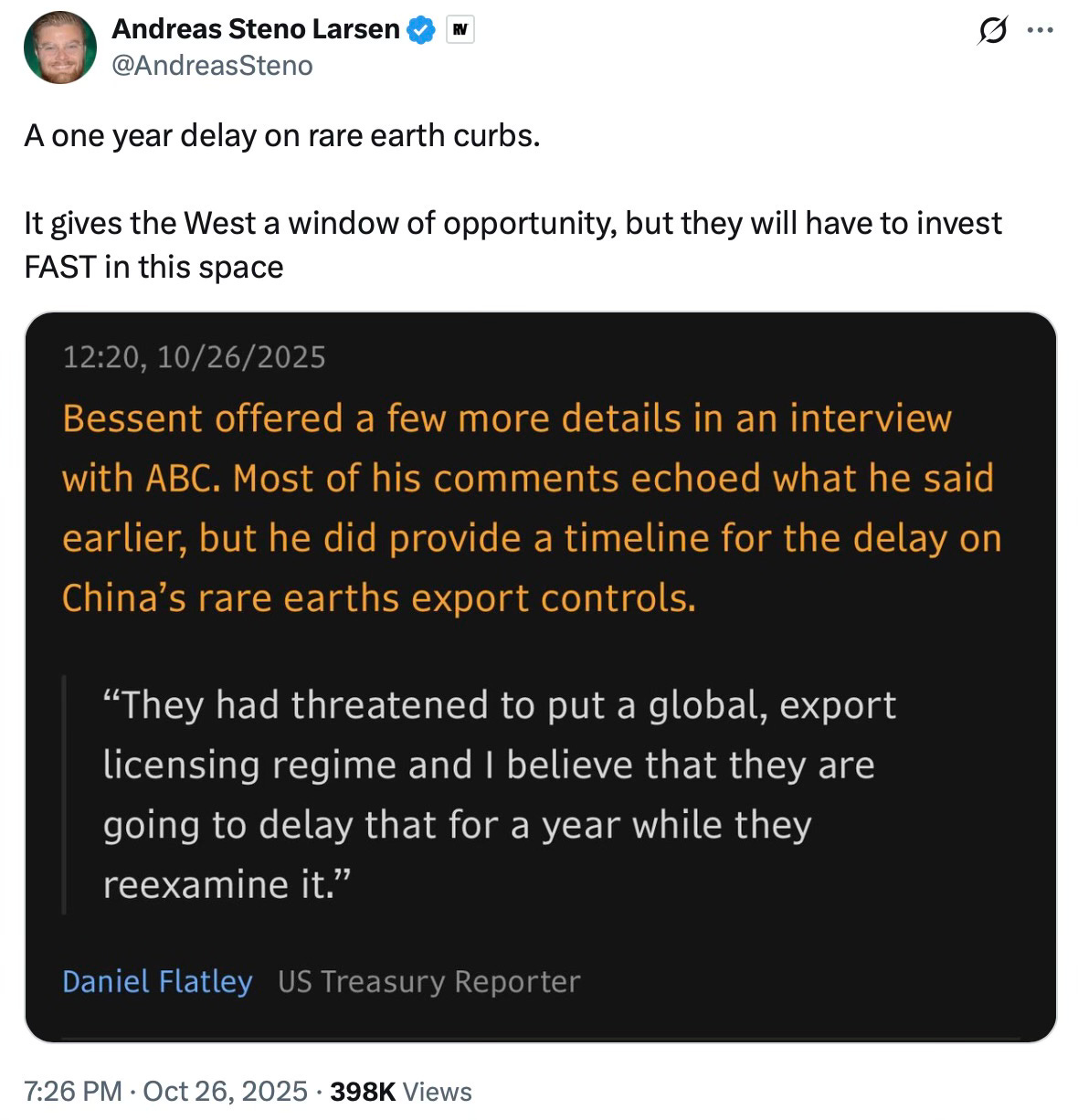 Så långt allt gott. Men Bessent var sparsmakad i detaljerna, särskilt vad gäller den viktigaste frågan, alltså Kinas exportkontrollerna på sällsynta jordartsmetaller. I en senare intervju med ABC News sade Bessent att han “trodde” att Kina ska fördröja kontrollerna i ett år, medan de ser över utformningen på nytt: