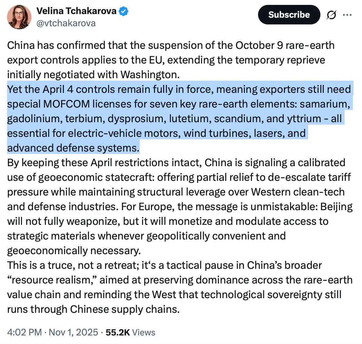 FÖRHANDLINGARNA OM SÄLLSYNTA JORDARTSMETALLER FORTSÄTTER MELLAN KINA OCH EU. Trots uppgifter om att Kina skrotar alla exportkontroller så pekar mycket på att situationen för EU förblir oförändrad.🇨🇳🇪🇺💬