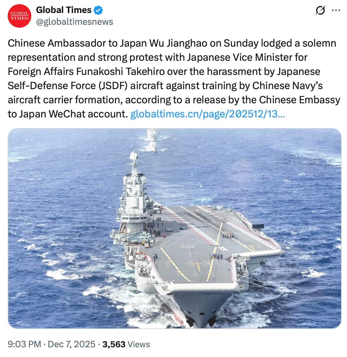 Mycket av kritiken föll dock sannolikt inför döva öron. Kina beskyllde nämligen Japan för att ha “trakasserat” den kinesiska hangarfartygsgruppen, och tagit sig in i den på förhand meddelade övningszonen: