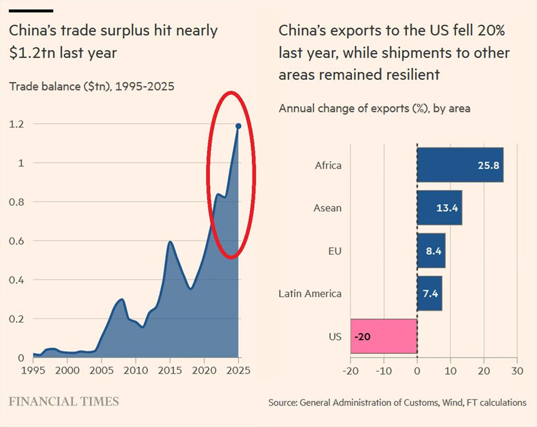 - China recorded the world’s biggest ever trade surplus in 2025, capping off a year in which the world’s largest manufacturer defied US trade pressure by ramping up exports to other global markets.