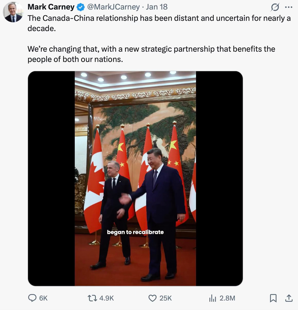 Se sent som i april i fjol beskrev Carney Kina som det största säkerhetspolitiska hotet mot Kanada. I samband med förra veckans besök i landet framhöll han dock vid en presskonferens att “världen har förändrats” på senare år, och menade att framstegen i relationen med Kina är positiva i att förbereda Kanada för den nya världsordningen.