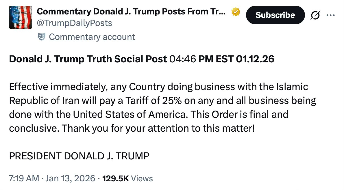 I förra veckans nyhetsbrev skrev jag närmare om vad USA:s attack mot Venezuela potentiellt betyder för Kina i allmänhet och dess agerade mot Taiwan i synnerhet. Det är också värt att lyfta vad oron i Iran kan betyda för Kina, då landet ofta beskrivs som en närmare samarbetspartner än Venezuela och dessutom säljer mer olja till Kina.
