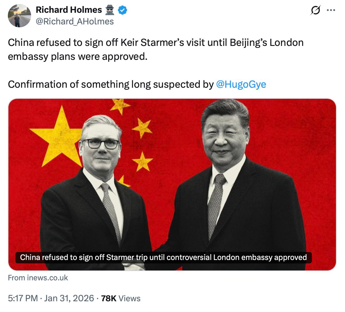 Innan besöket gav Starmers regering klartecken till Kinas kontroversiella “superambassad” i centrala London som jag skrev närmare om i Kinamedia nyhetsbrev #302 för två veckor sedan.