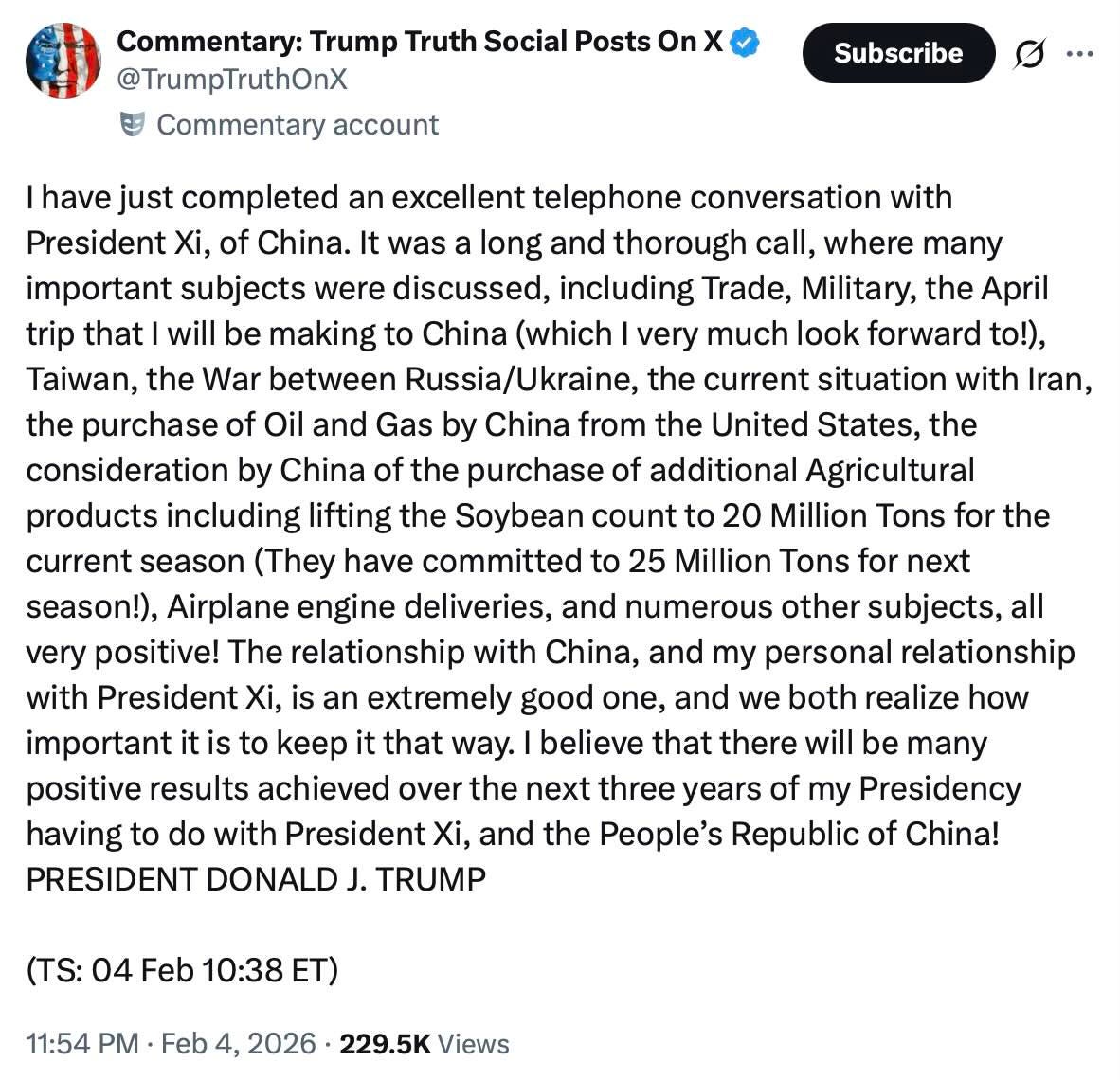 I veckan pratade Xi Jinping och Donald Trump på telefon i två timmar. Sin vana trogen så beskrev Trump pratstunden som fantastisk, och meddelade via sociala medier att de två pratade om allt från Iran till Ukraina och sojabönor: