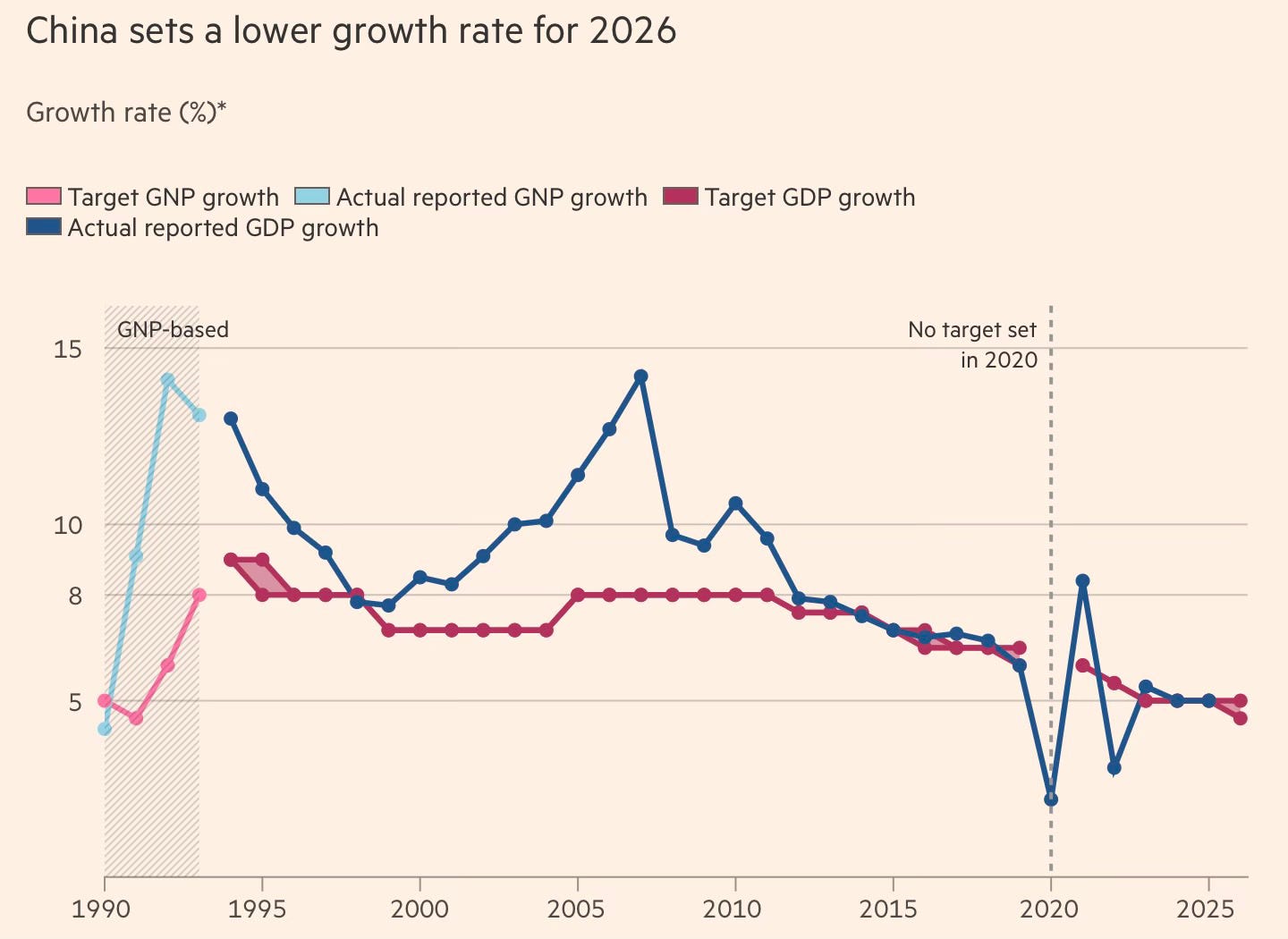 En av de mest uppmärksammade siffrorna som presenteras vid varje folkkongress är tillväxtmålet för innevarande år. Målsättningen för 2026 är mellan 4,5 och 5 procent, vilket är det lägsta tillväxtmålet sedan 1991.