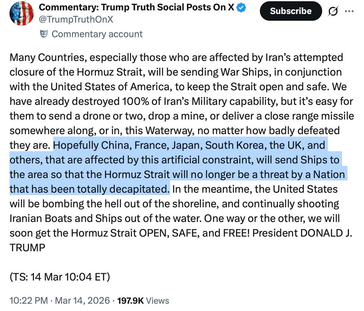 Uttalandet sker också efter att Trump uppmanat flera länder, inklusive Kina, att skickar krigsfartyg till Iran för att häva Irans kontroll över Hormuz-sundet:
