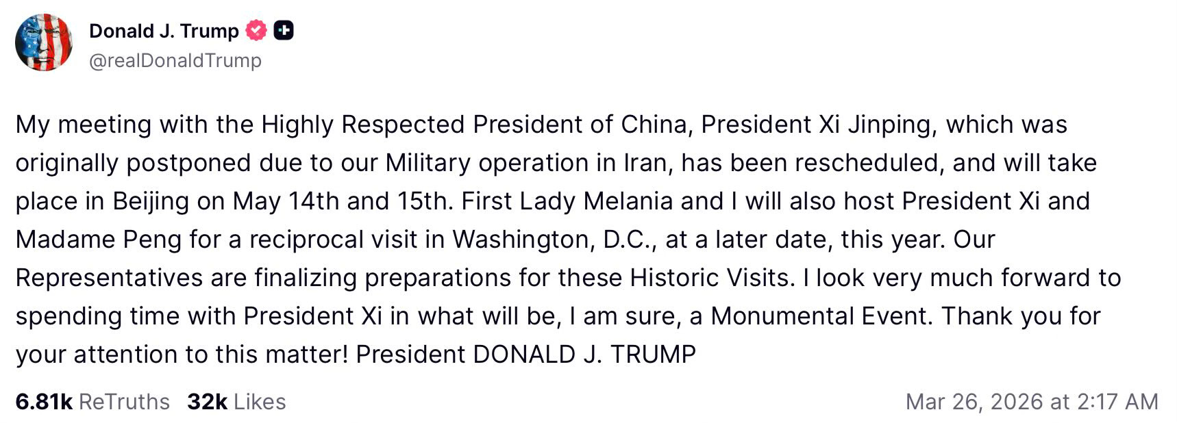 Enligt Vita husets pressekreterare ska Trump dessutom ta emot Xi Jinping och hans fru i Washington senare i år. Efter presskonferensen postade Trump också följande meddelande på Truth Social:
