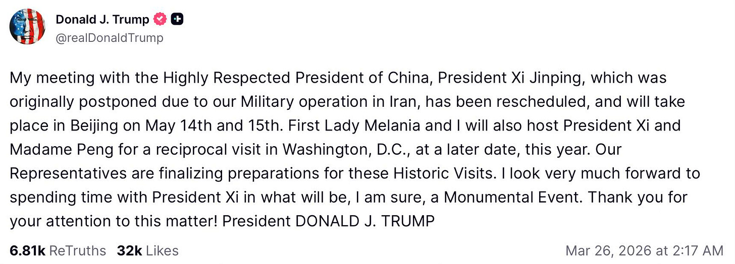 I förra veckans nyhetsbrev skrev jag om hur det är fördel Kina då Donald Trump på grund av kriget i Iran tvingades att skjuta upp sin resa till Peking som skulle ha ägt rum i morgon den 31 mars . Nu har Vita huset meddelat nya datum; 14-15 maj.