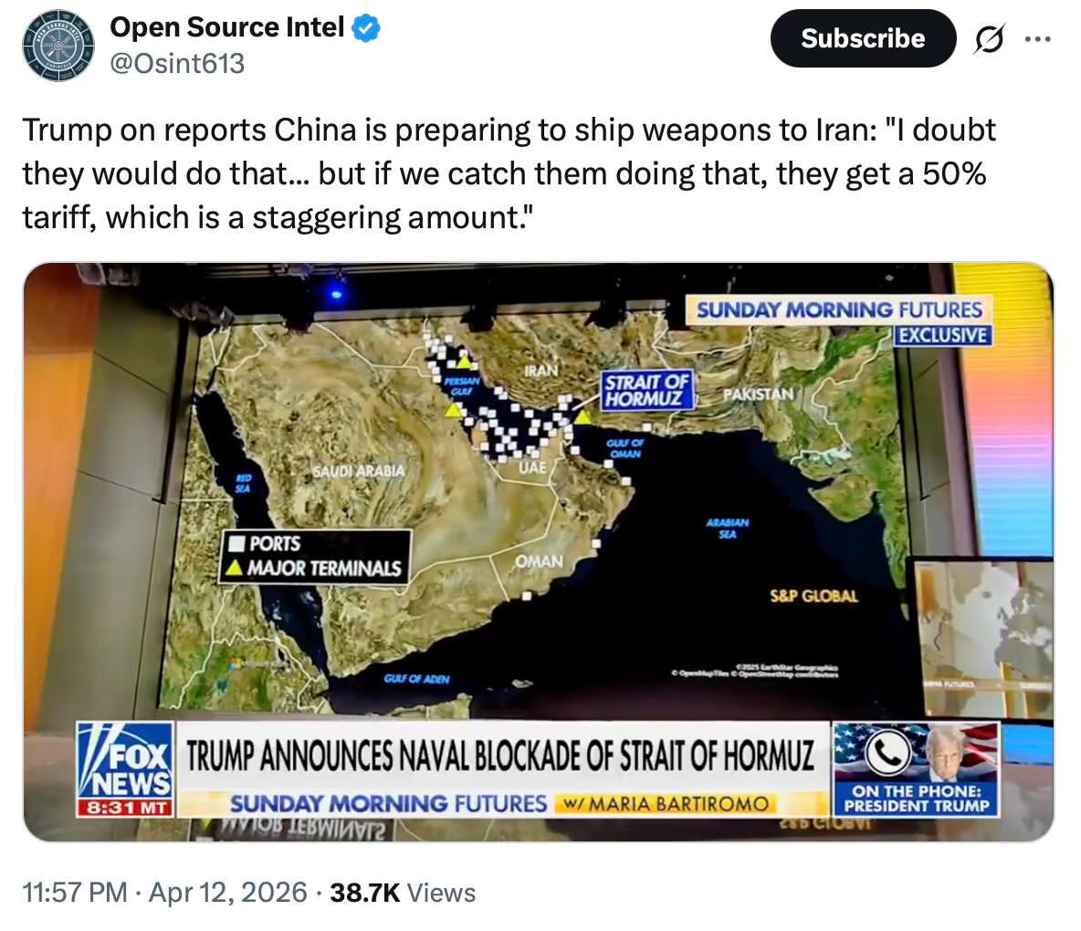 Donald Trump sade till reportrar på Vita husets gräsmatta att Kina kommer få “stora problem” om de exporterar vapen till Iran. Men vad ska USA i så fall göra? Trots att USA i fjol tvingades att backa i handelskriget mot Kina, så pratade Trump i går på Fox News om 50 procents tullar mot Kina om de förser Iran med vapen: